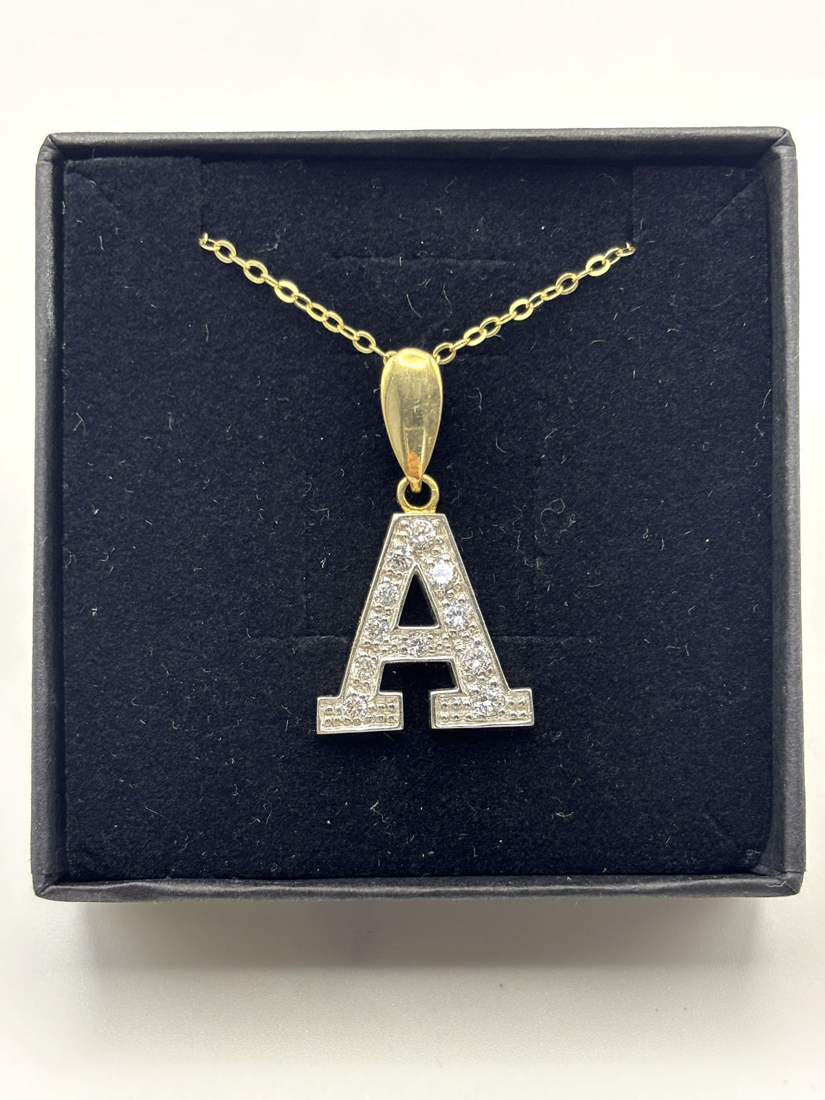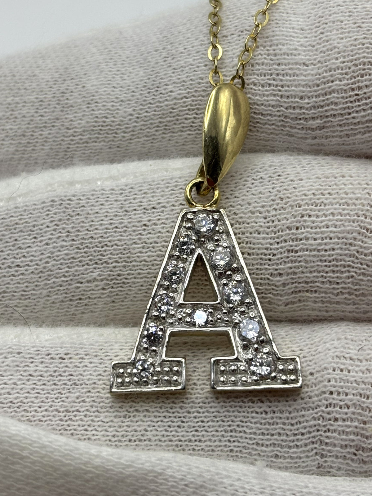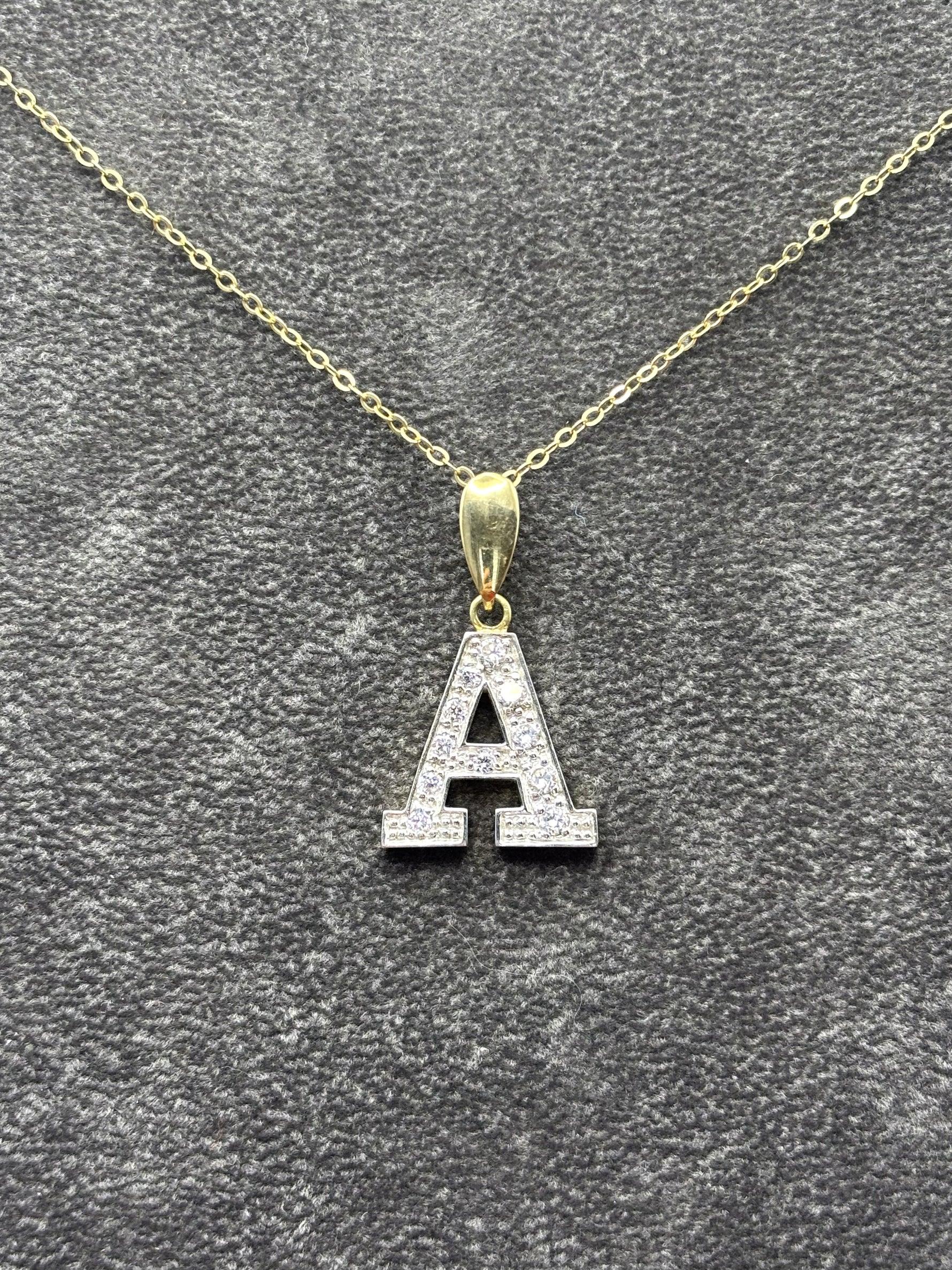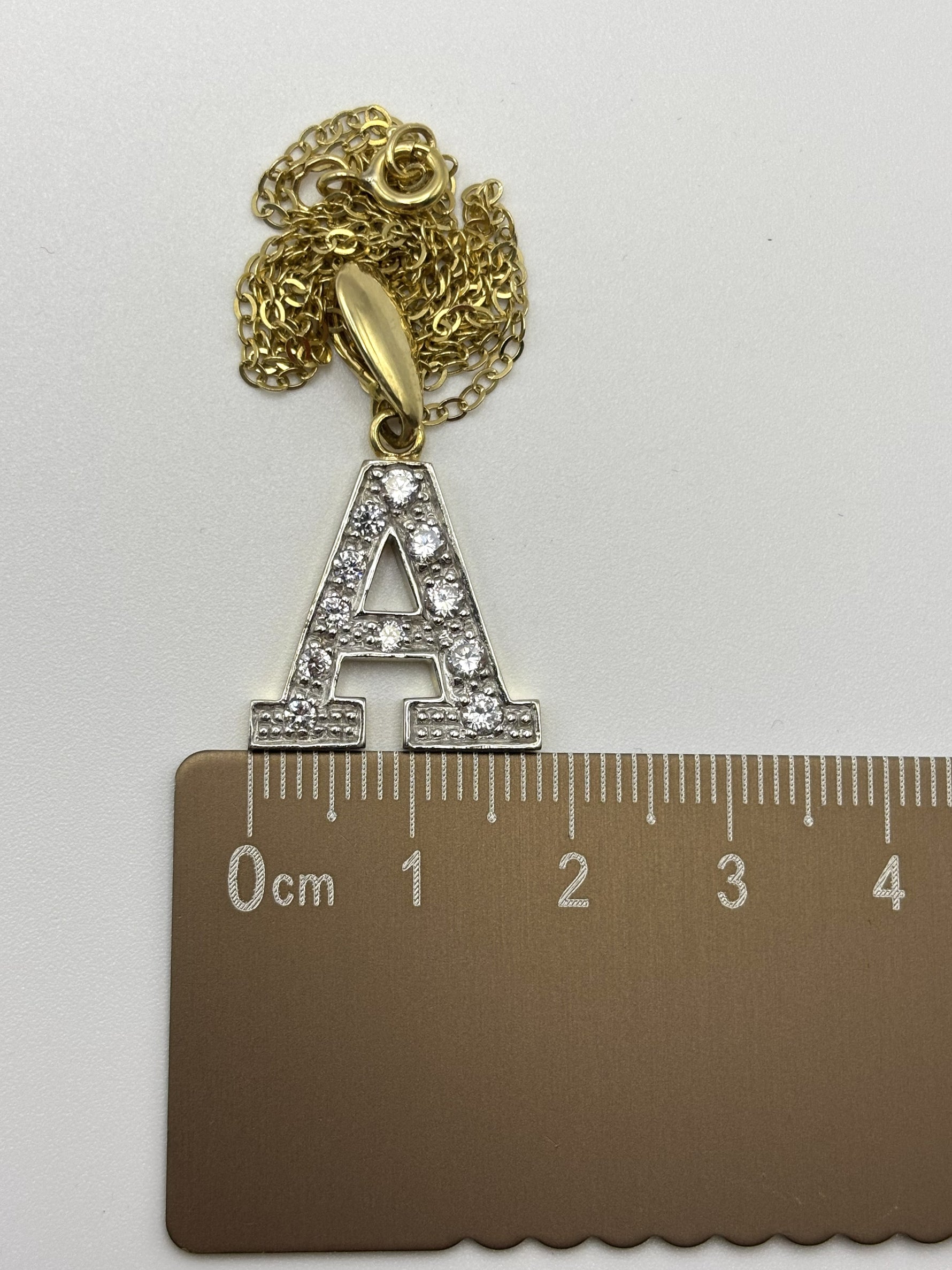 9ct Yellow Gold BIG ‘A’ Initial Pendant and Chain Necklace with Sparkling Stones