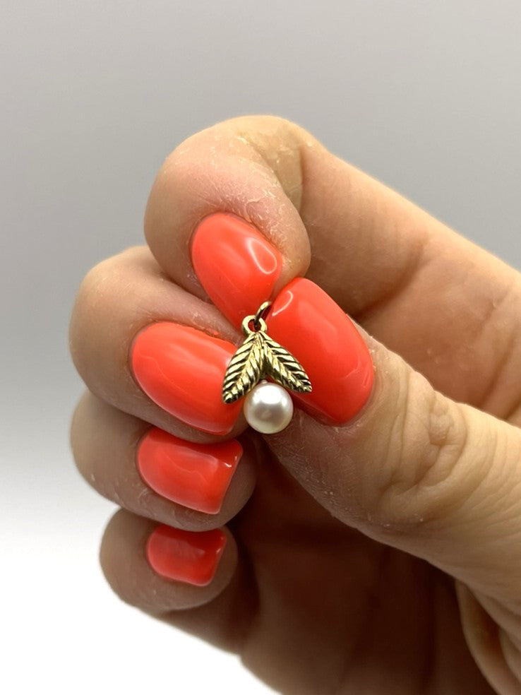 This beautiful petite pendant features a lustrous pearl framed by delicately textured gold leaves. It looks stunning on a simple chain as an everyday piece, and it layers brilliantly with a pearl necklace. Imagine it: a fine gold chain with this little beauty, paired with a classic strand of pearls. Splendid.