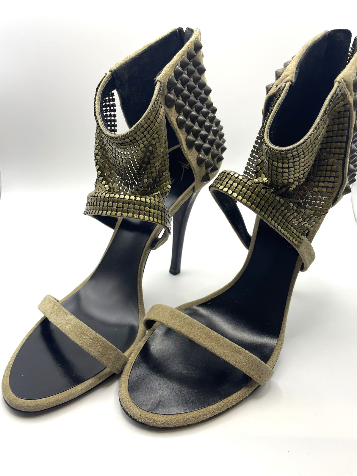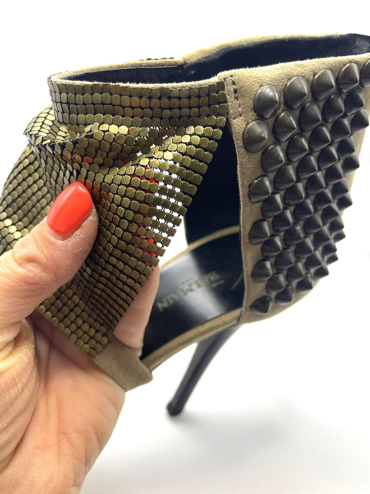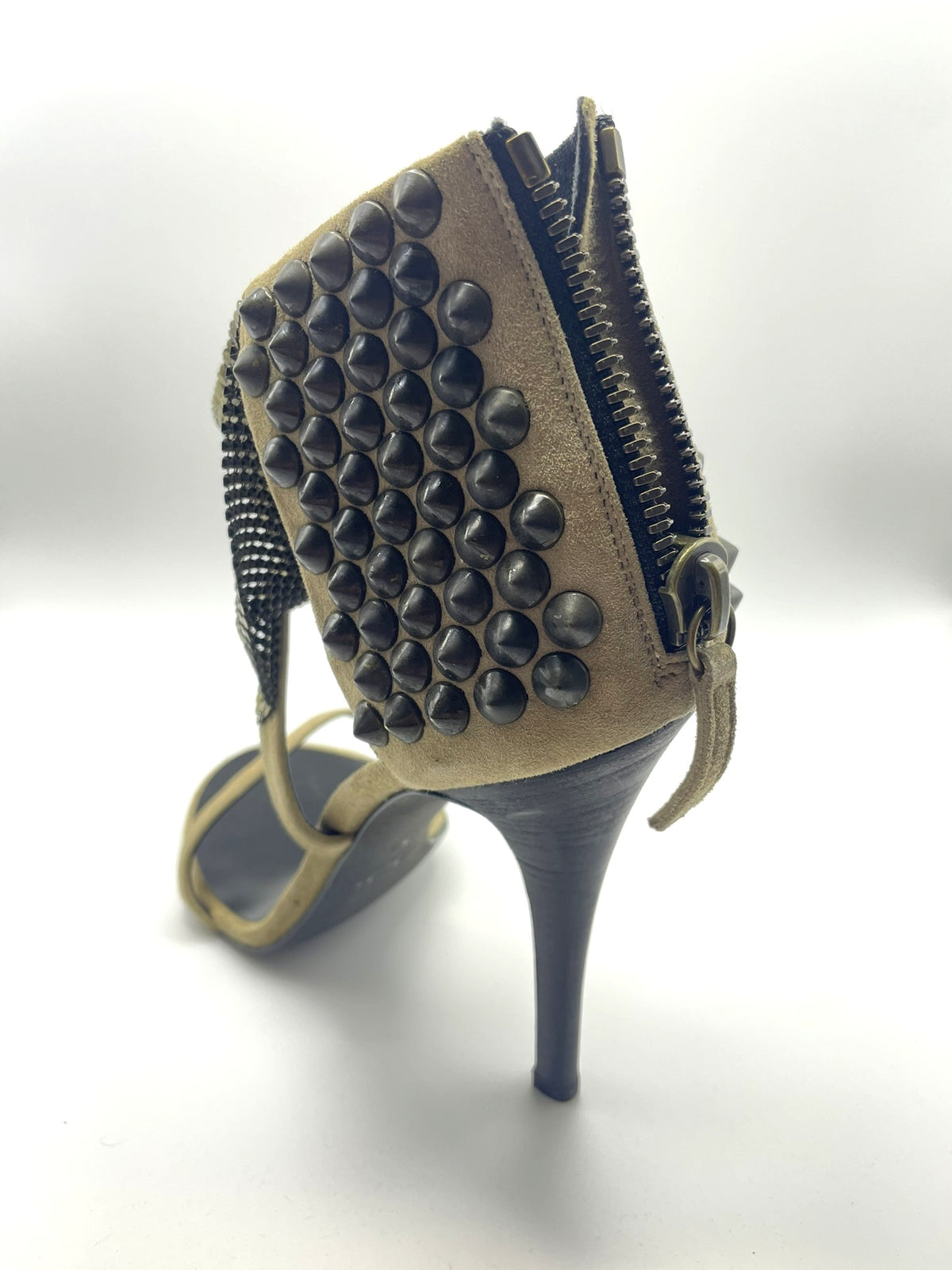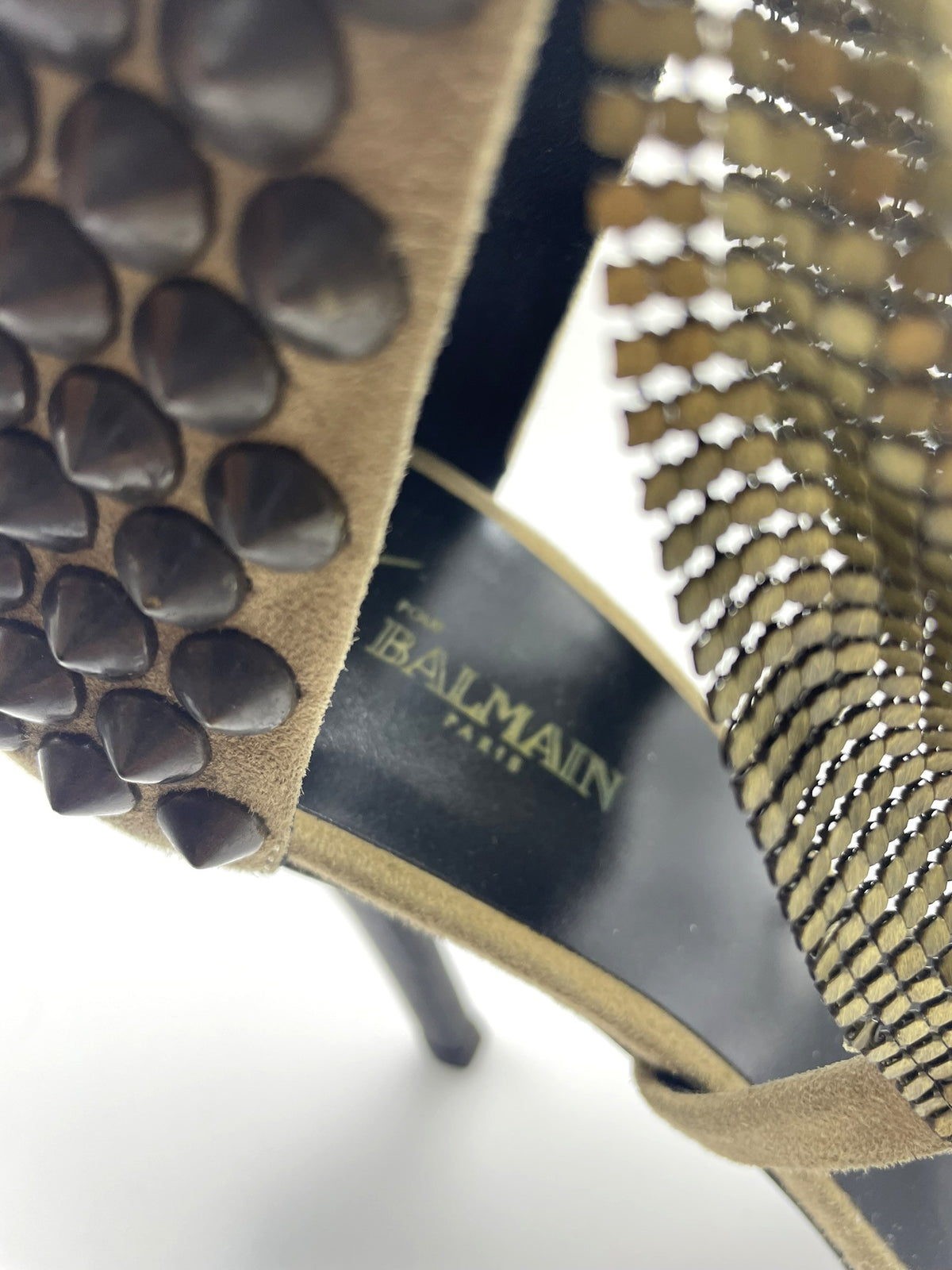 Material: Beige suede with off-gold chainmail mesh and studs