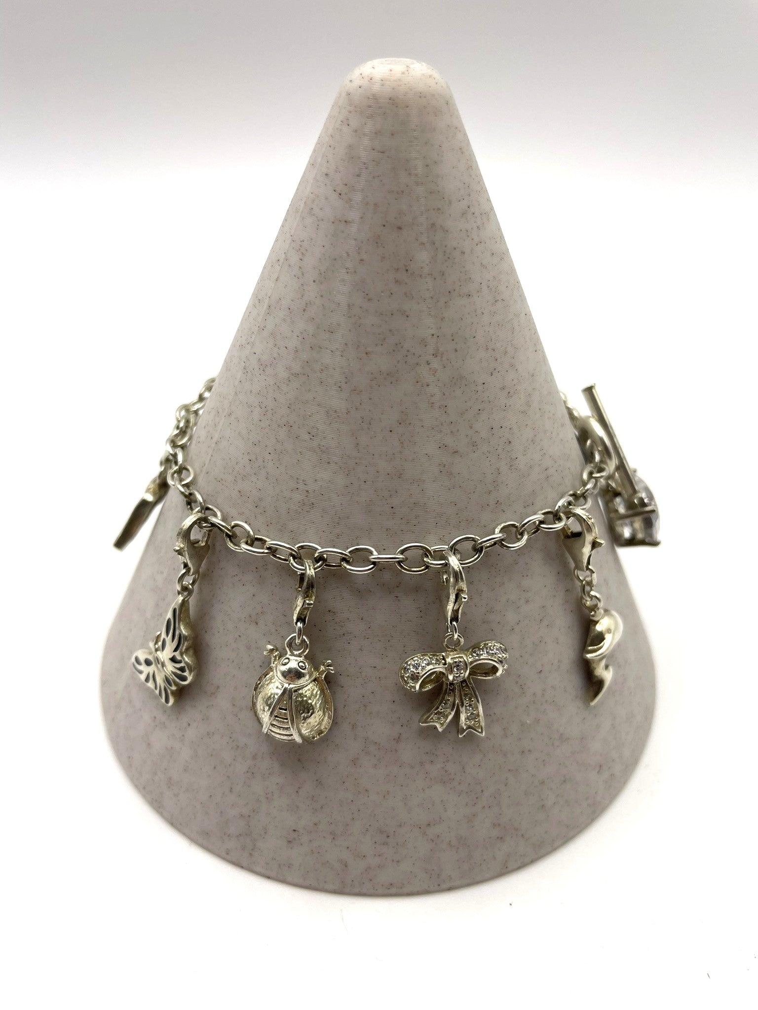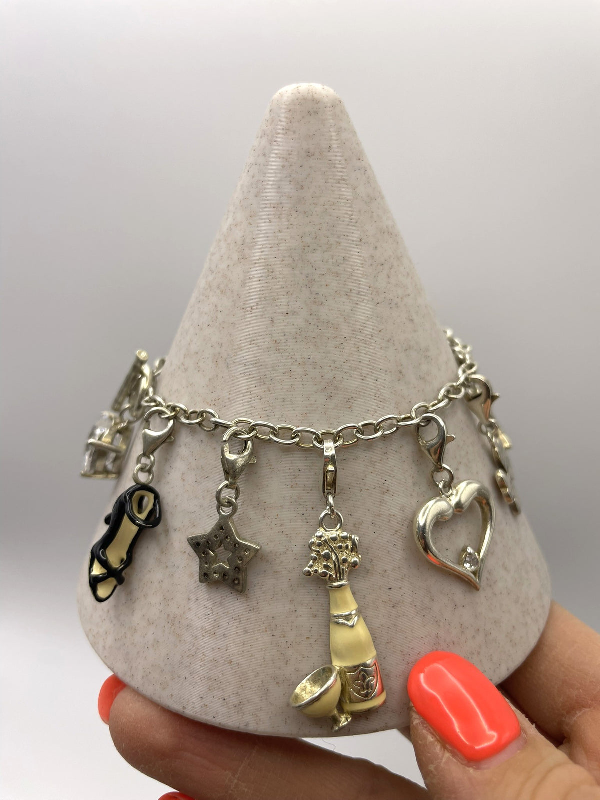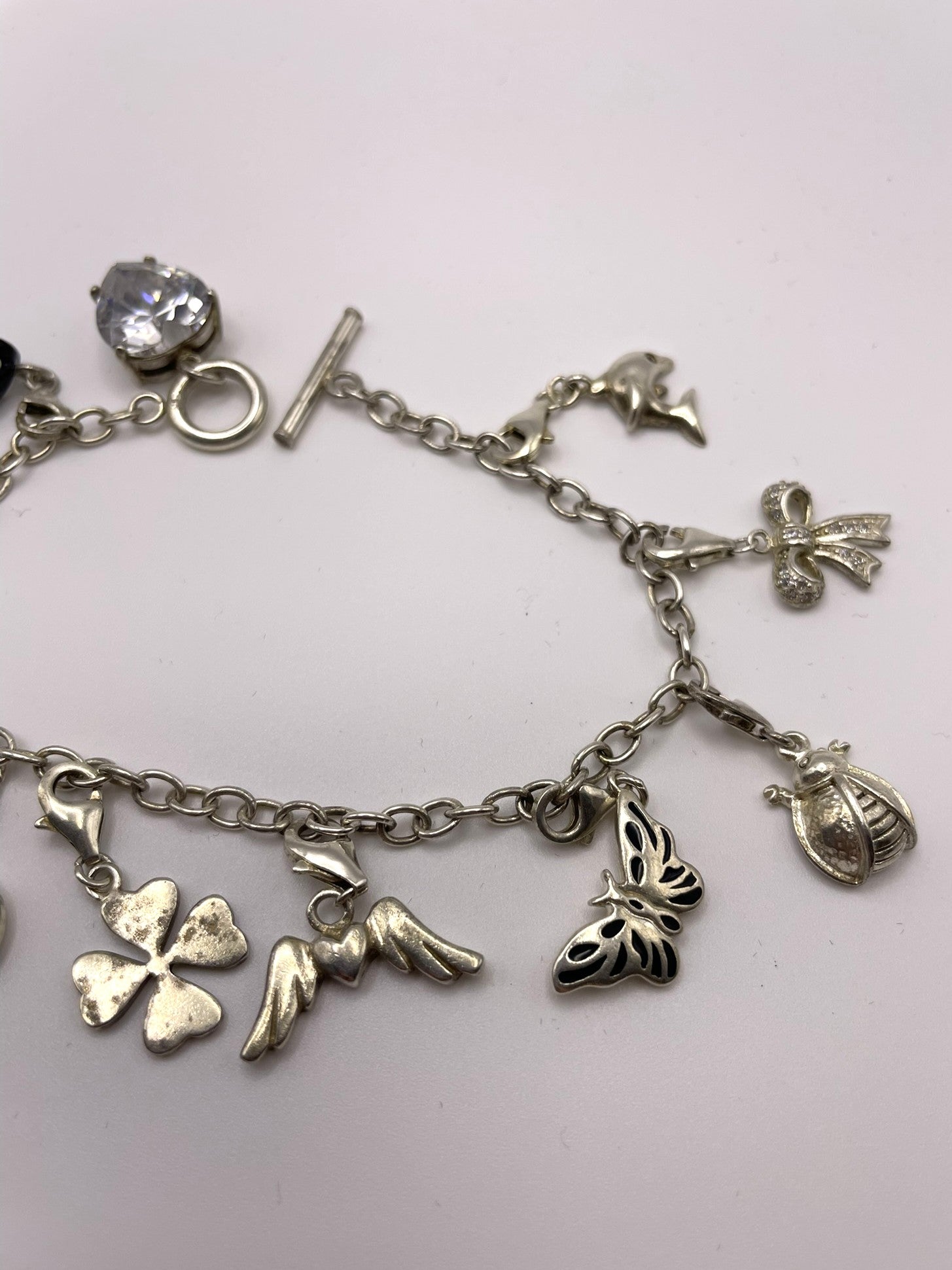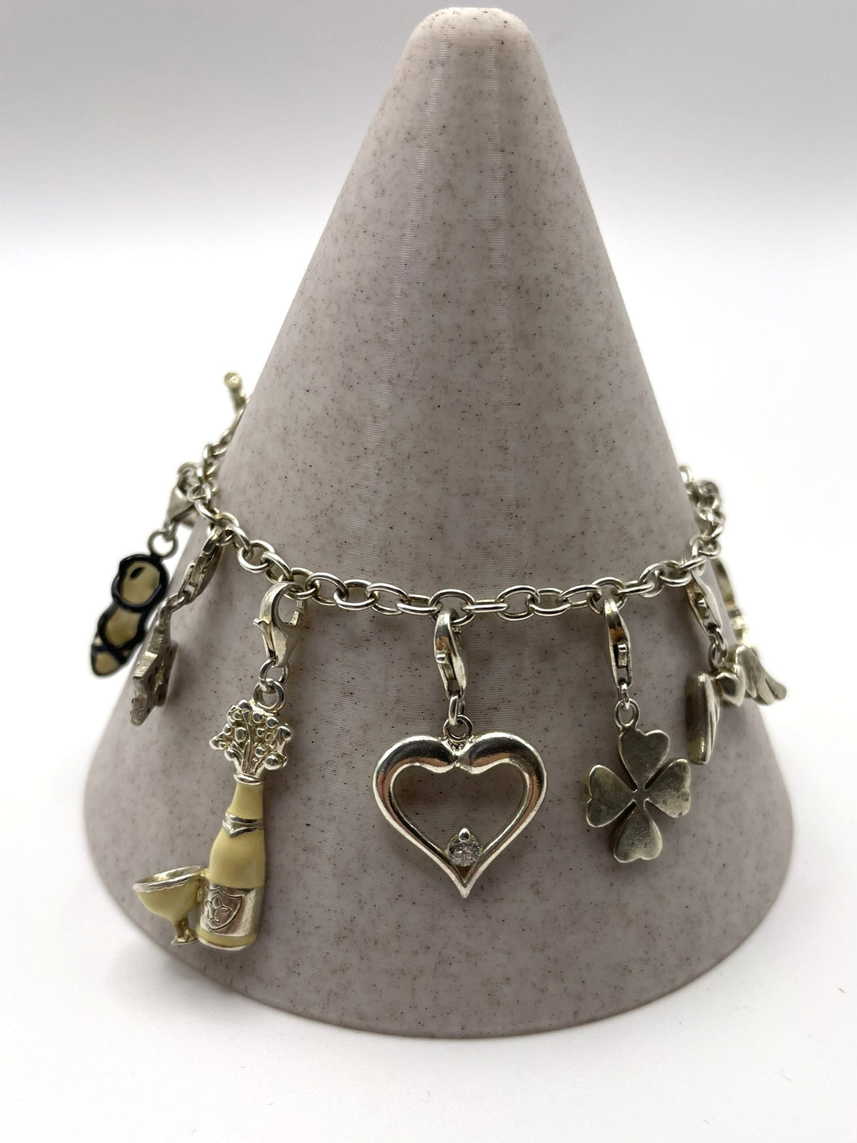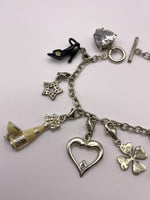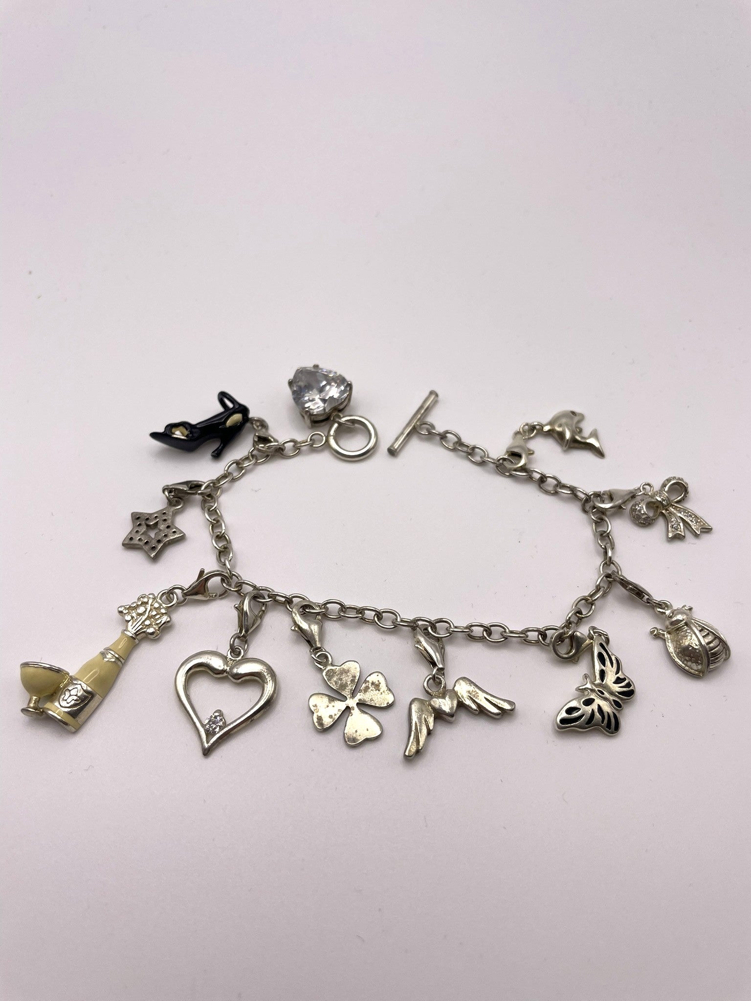 Charms (11 total): Crystal heart, champagne bottle, stiletto, heart with wings, ladybird, star, heart with crystal, dolphin, shamrock, butterfly, bow