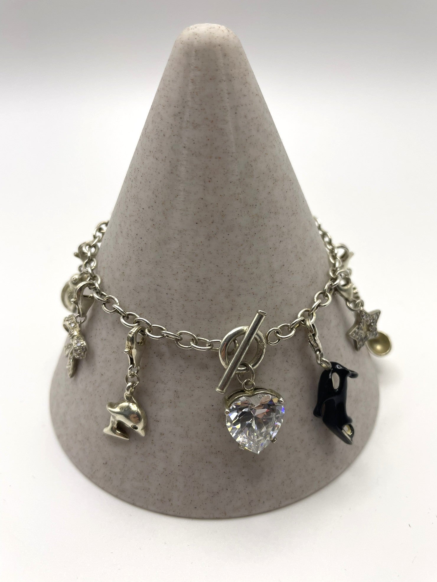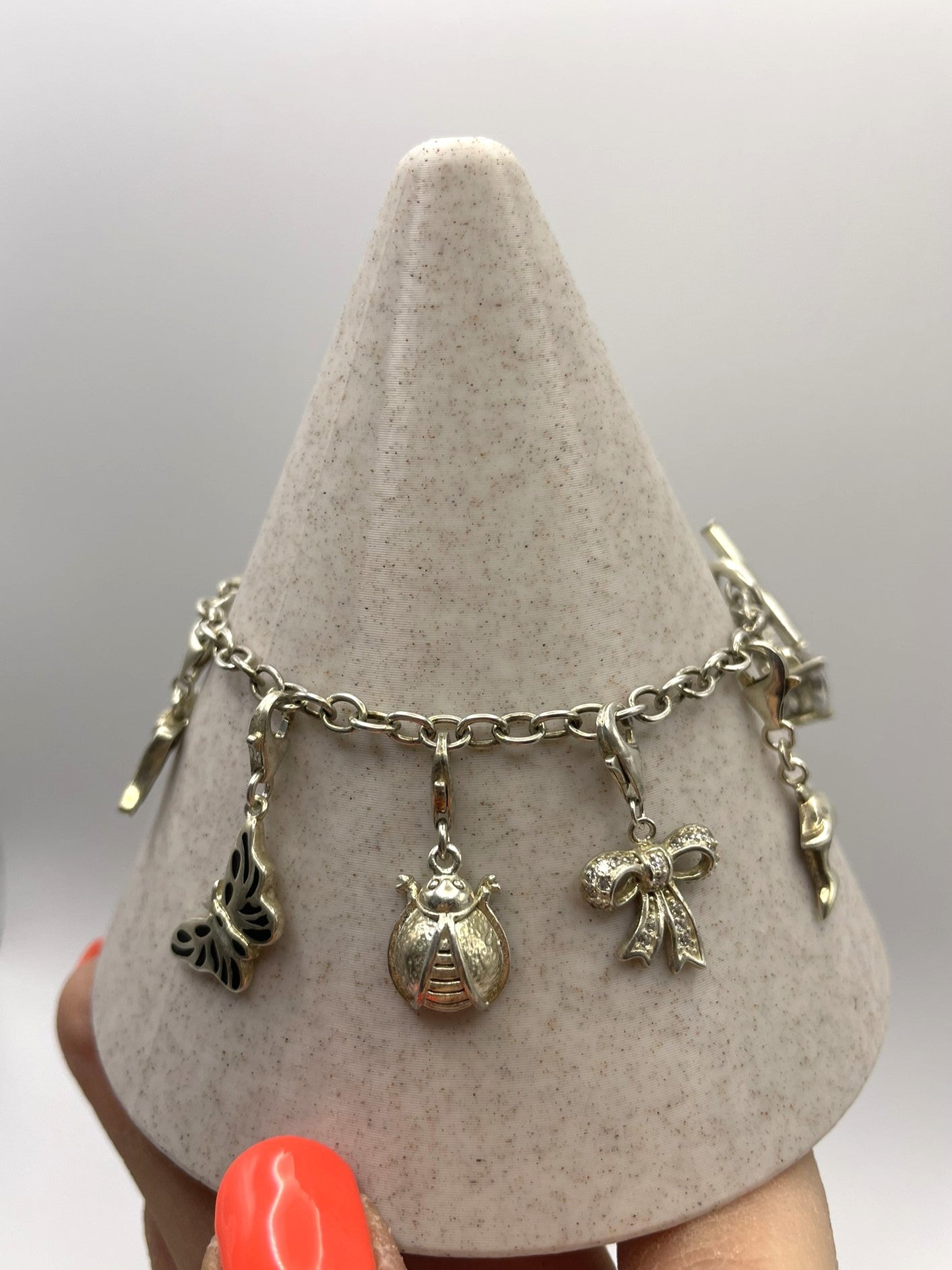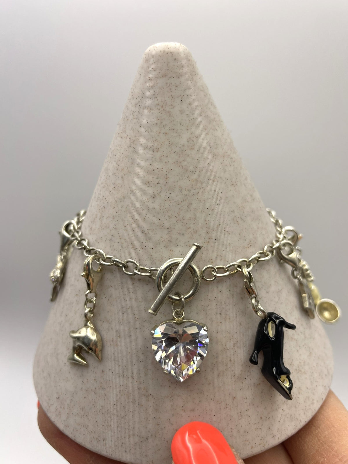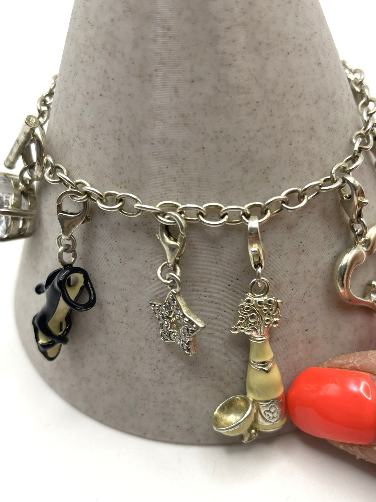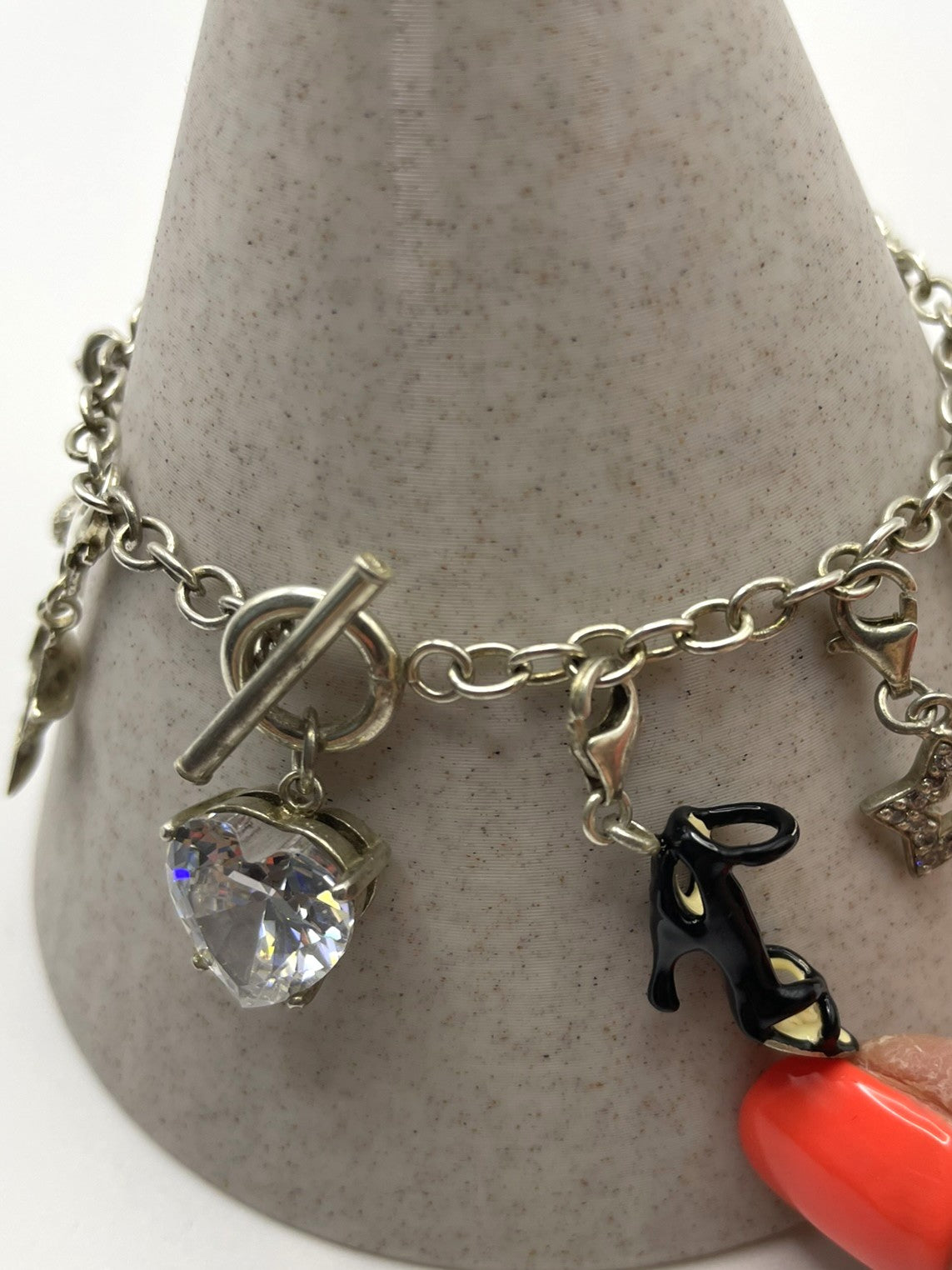 Charms (11 total): Crystal heart, champagne bottle, stiletto, heart with wings, ladybird, star, heart with crystal, dolphin, shamrock, butterfly, bow