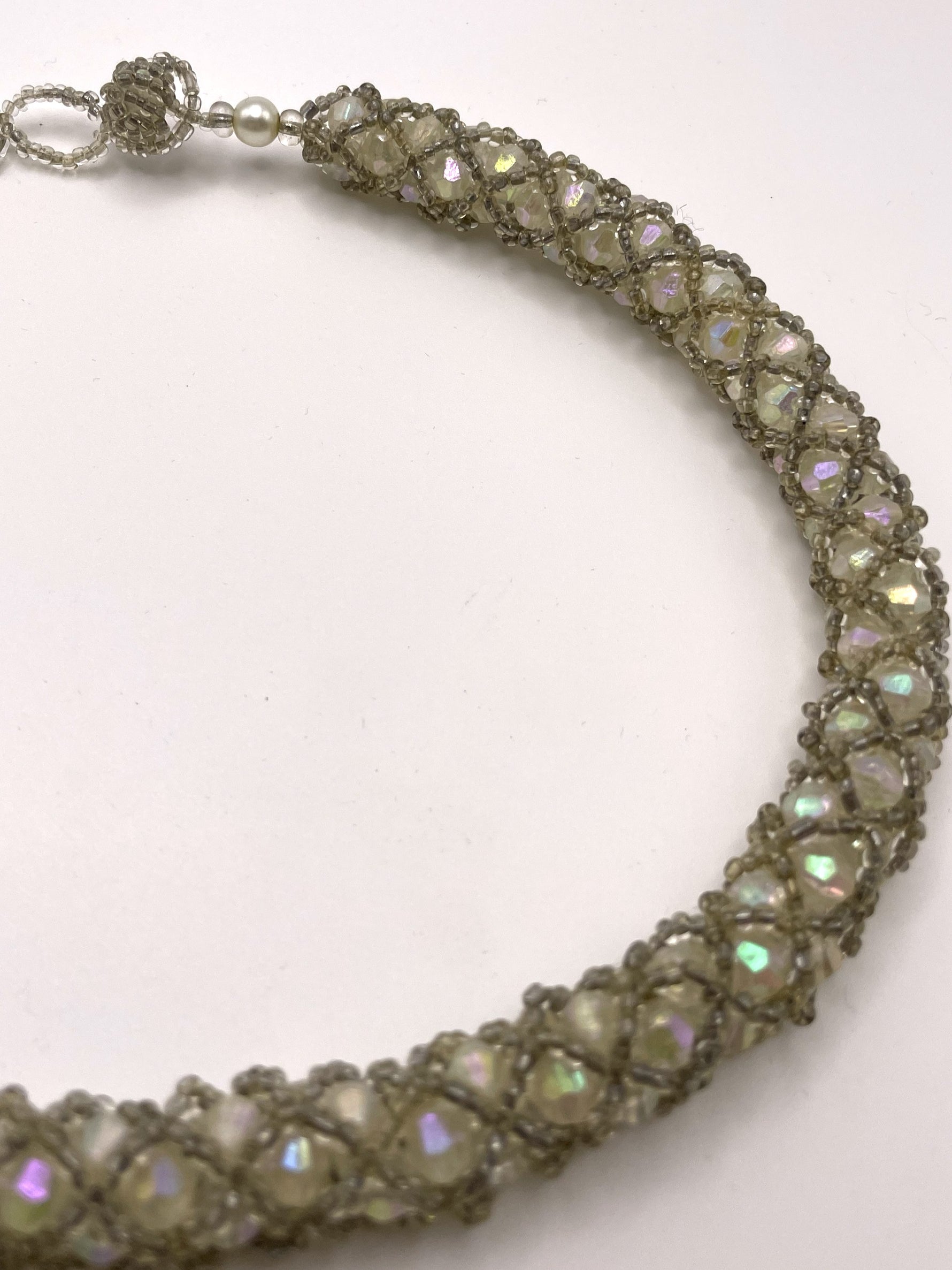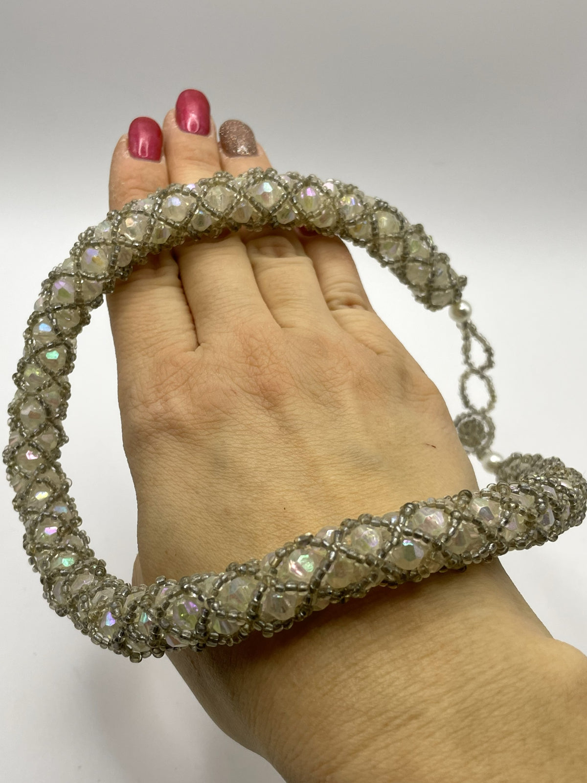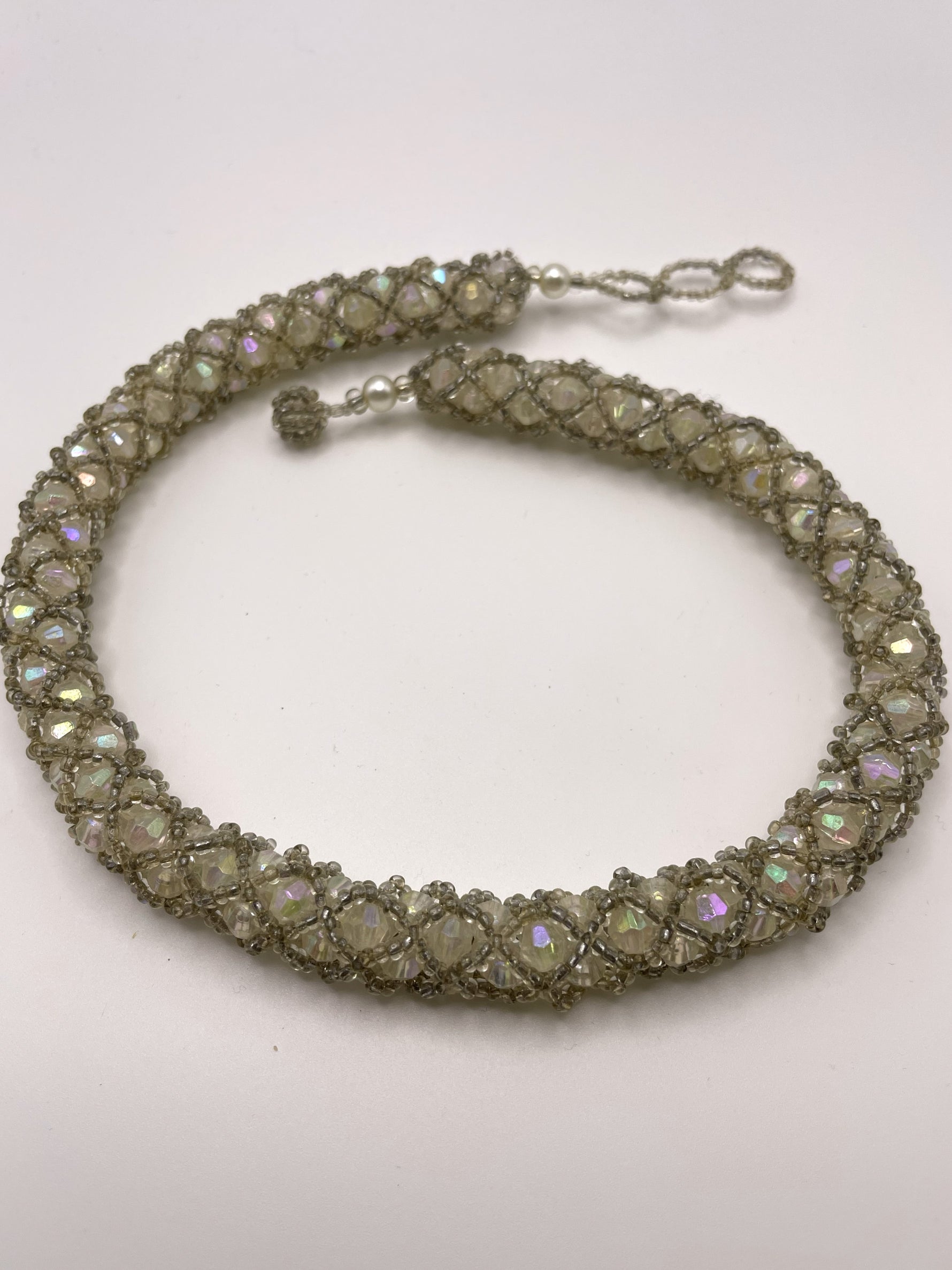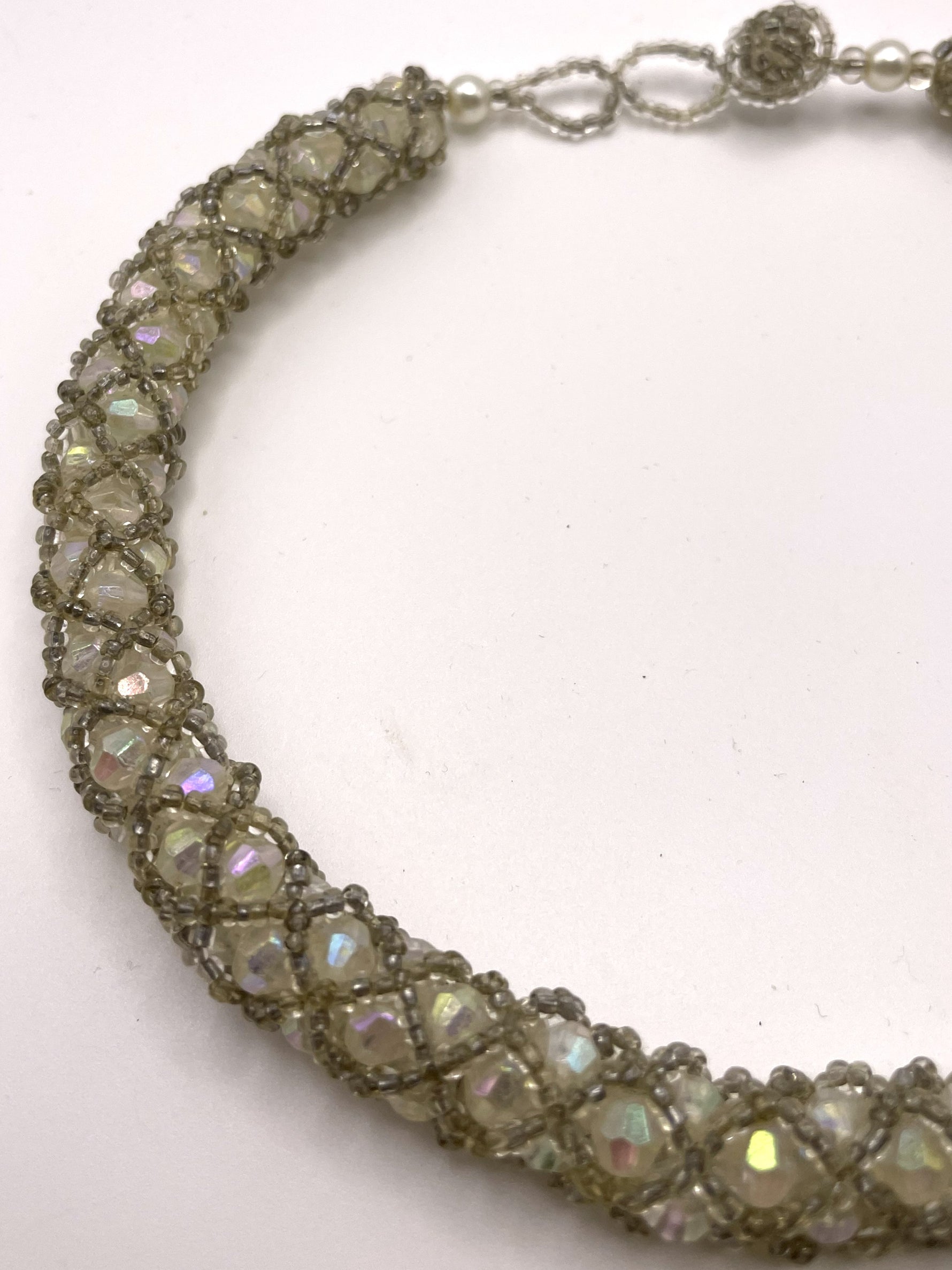 Material: Glass beads (Aurora Borealis finish), might be Swarovski crystal components