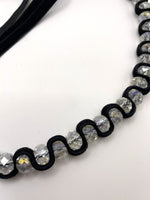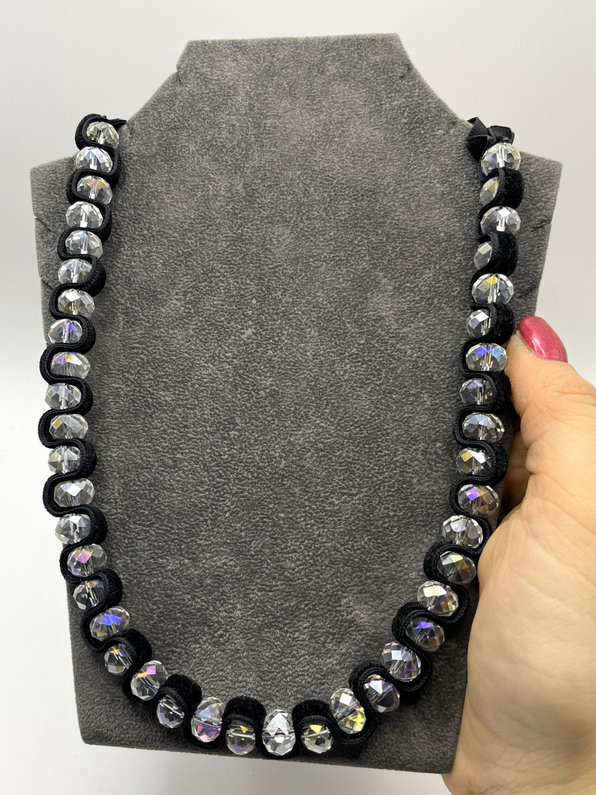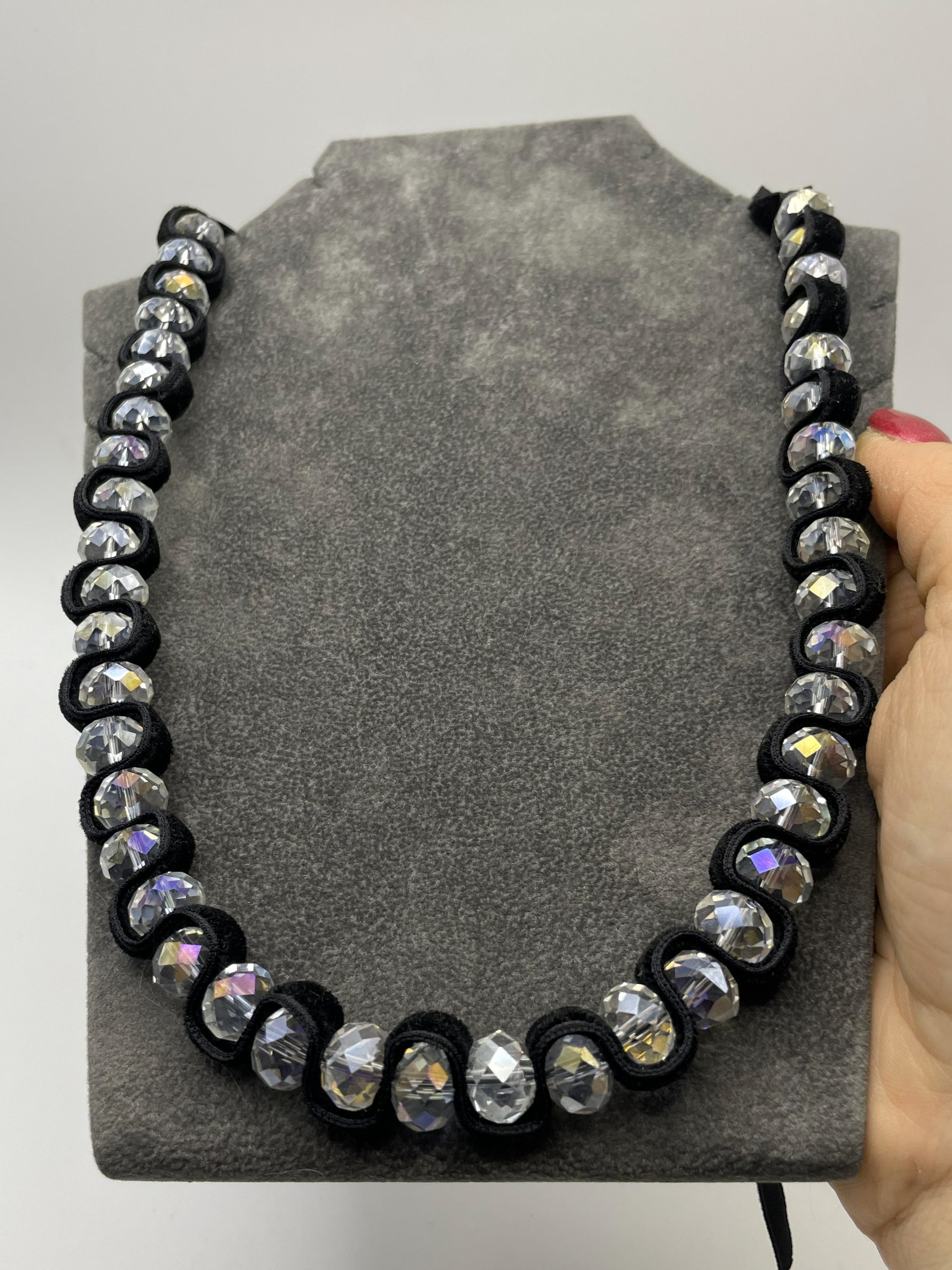Divine Glass Beads Necklace With Aurora Borealis Finish Wrapped Around a Black Velvet Ribbon